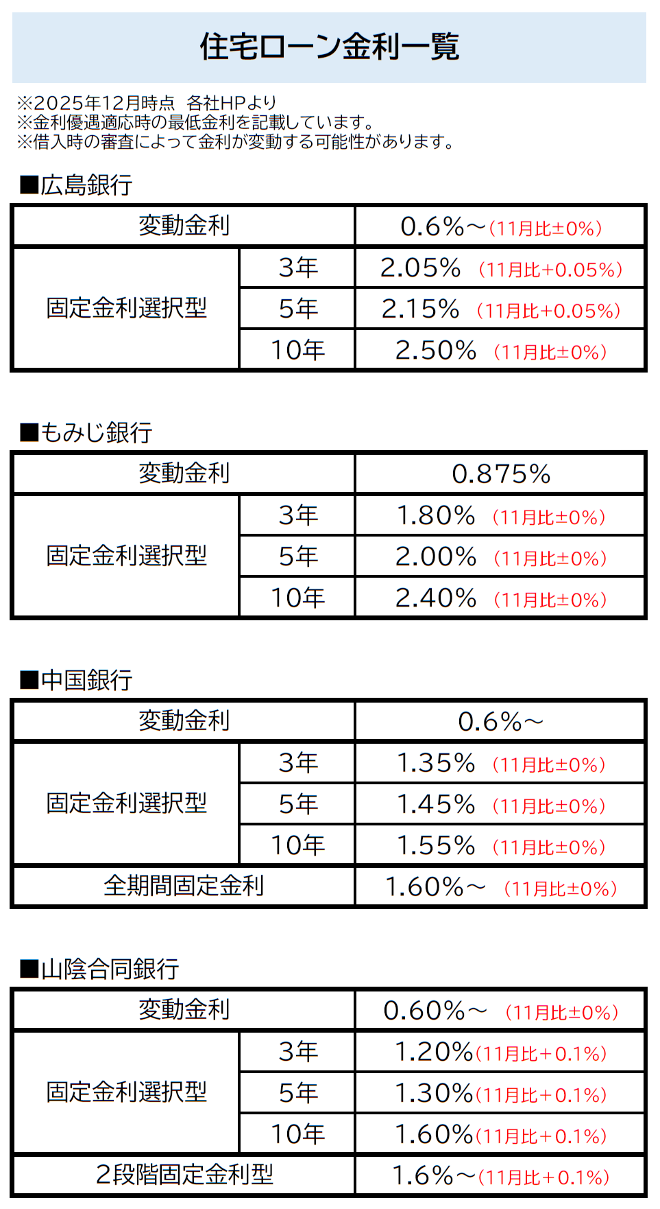 以下は2025年12住宅ローン金利月時点の住宅ローン金利一覧です。